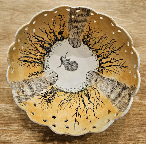 Ostrich egg tempera on hand-carved ostrich eggshell, 4 1/2 × 5 in...