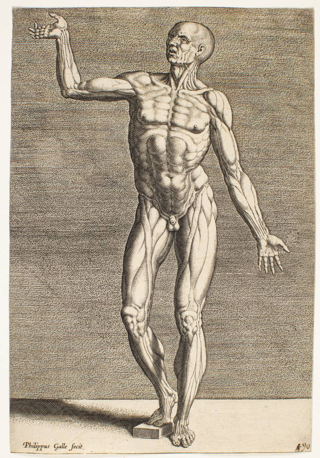 Studie af menneskefigur med blotlagte sener og muskler, set forfra