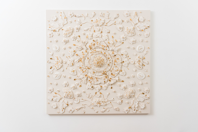 Porcelain, clear glaze and 22k luster, on painted wood panel, 59 × 59 × 5 in.