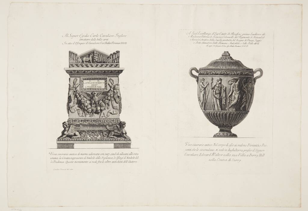 Cinerary urn ornamented with an owl flanked by bucrania with sphinxes below and cinerary urn decorated with a frieze of bacchantes
