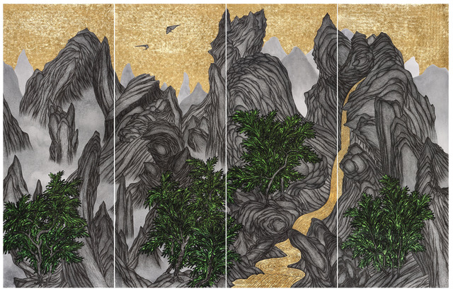 India Hand made paper, India ink, Gold Leaf, 142.5 × 304.8 cm...