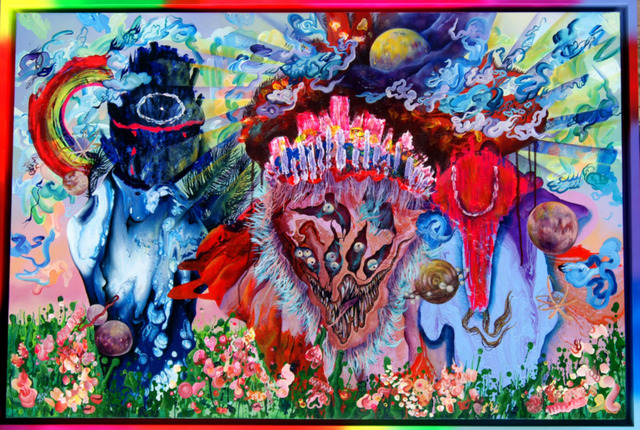 Acrylic paint, oil paint, and spray paint on canvas, 80 × 120 × 4 cm.