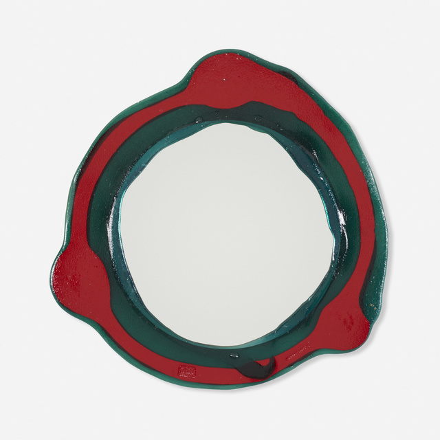 A well-articulated, concave lip borders the periphery of this circular mirror; the mirror's slightly countersunk back is flat and unembellished, save for two concentric pairs of in...