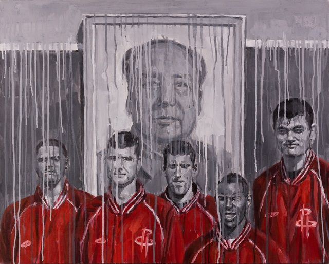This triptych comprises a set of three hanging scrolls, each painted in ink on paper. The central scroll is a formal portrait of Mao Zedong (1893–1976); the flanking scrolls repres...