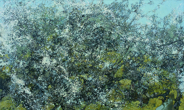 Painted in ink on paper by Arnold Chang (Zhang Hong; b. 1954), this hanging scroll represents a mountainous landscape with a lake, river, or other body of water in the immediate fo...