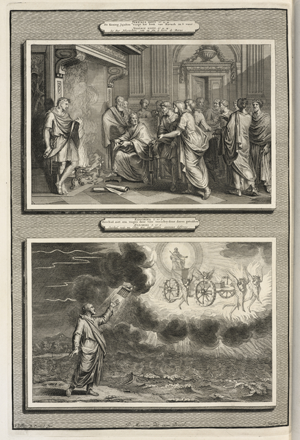 Title: Bernard Picart, King Jehoiakim throws the book of Baruch into fire ; Ezekiel sees a cart drawn by four animals (1700)