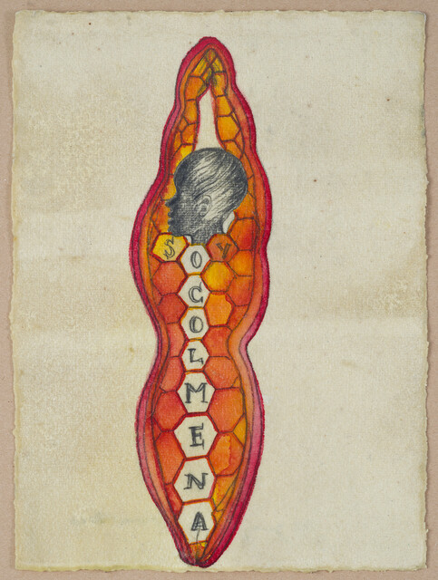 Graphite pencil, watercolour on paper, wax, 38 × 28 cm.