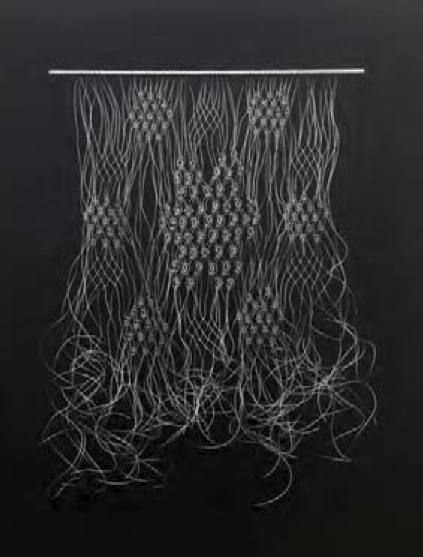 Alü minyum çubuk, 1.5 mm tel, her parça özgü n, örgü motiifi telin kesitinde varolan şeklindenesinlenerek yapılmıştır / Aluminium stick, 1.5 mm wire cable, each piece is unique, theknotting patterns of the macrame are visualizations of the pattern inherent in the cable itself, 140 × 106 cm