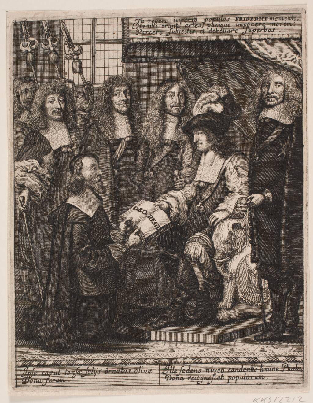 Title: Simon Paulli overrækker Frederik III en bog. Illustration til Simon Paulli, "Quadripartitum Botanicum", 1667