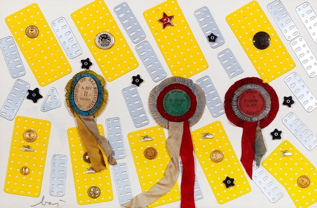 Mixed media and collage of metal elements, trimmings and buttons on cardboard laid on canvas, 38 × 56 cm