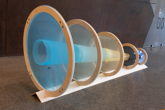 Plywood, Plastic mesh, wire, and hardware, 54 × 54 × 121 in.