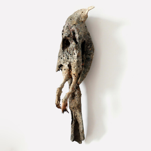 Deer, fox, cow & sheep bone; adhesive, sheep tooth, wood, found wire, branch, clay, straw, leaves, ash, catkins, graveyard soil, fox earth, blood; jackdaw pecks & scratches, fox scratches & bites, sheep & blackbird marks, 24 × 7 cm