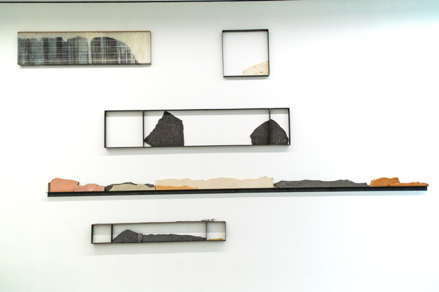 Metal structures, enclosure, marble, carved stone, stone with flattened earth, gold leaf and aluminum, 225 × 435 × 6 cm