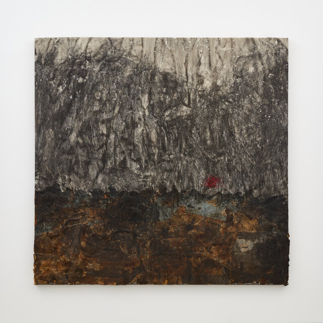 Mixed-media and acrylic on canvas, 162 × 166 cm.