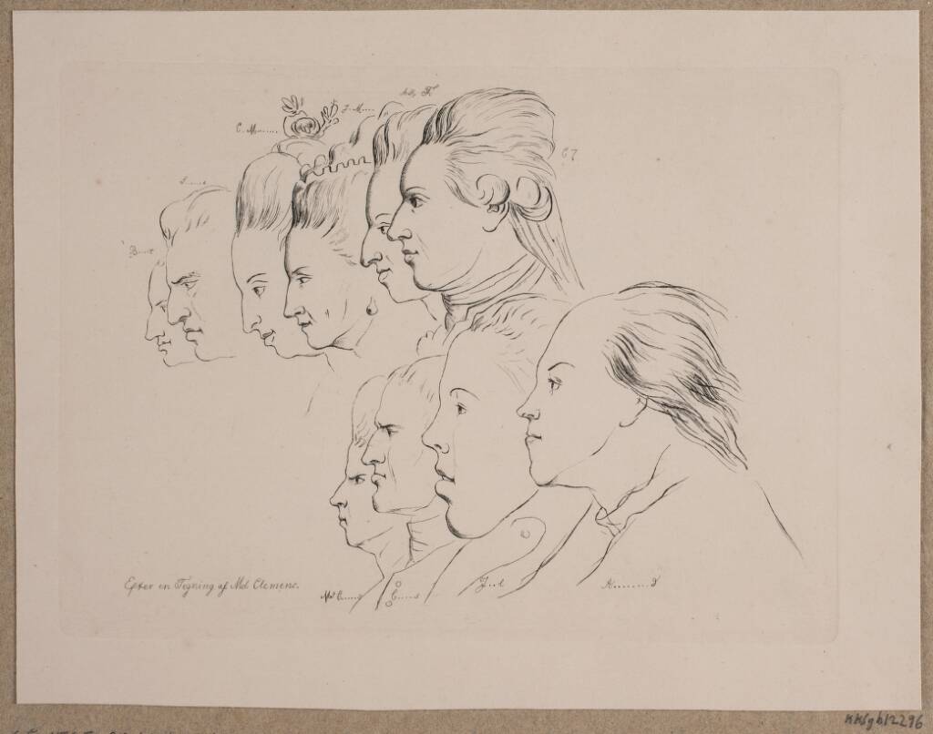 Title: 10 portrætter: Enevold Brandt, Johann Friedrich Struensee, Caroline Mathilde, Julieane Marie, Arveprins Frederik, Christian VII, Marie Jeanne Clemens, J. F. Clemens, Jens Juel og Nicolai Abildgaard